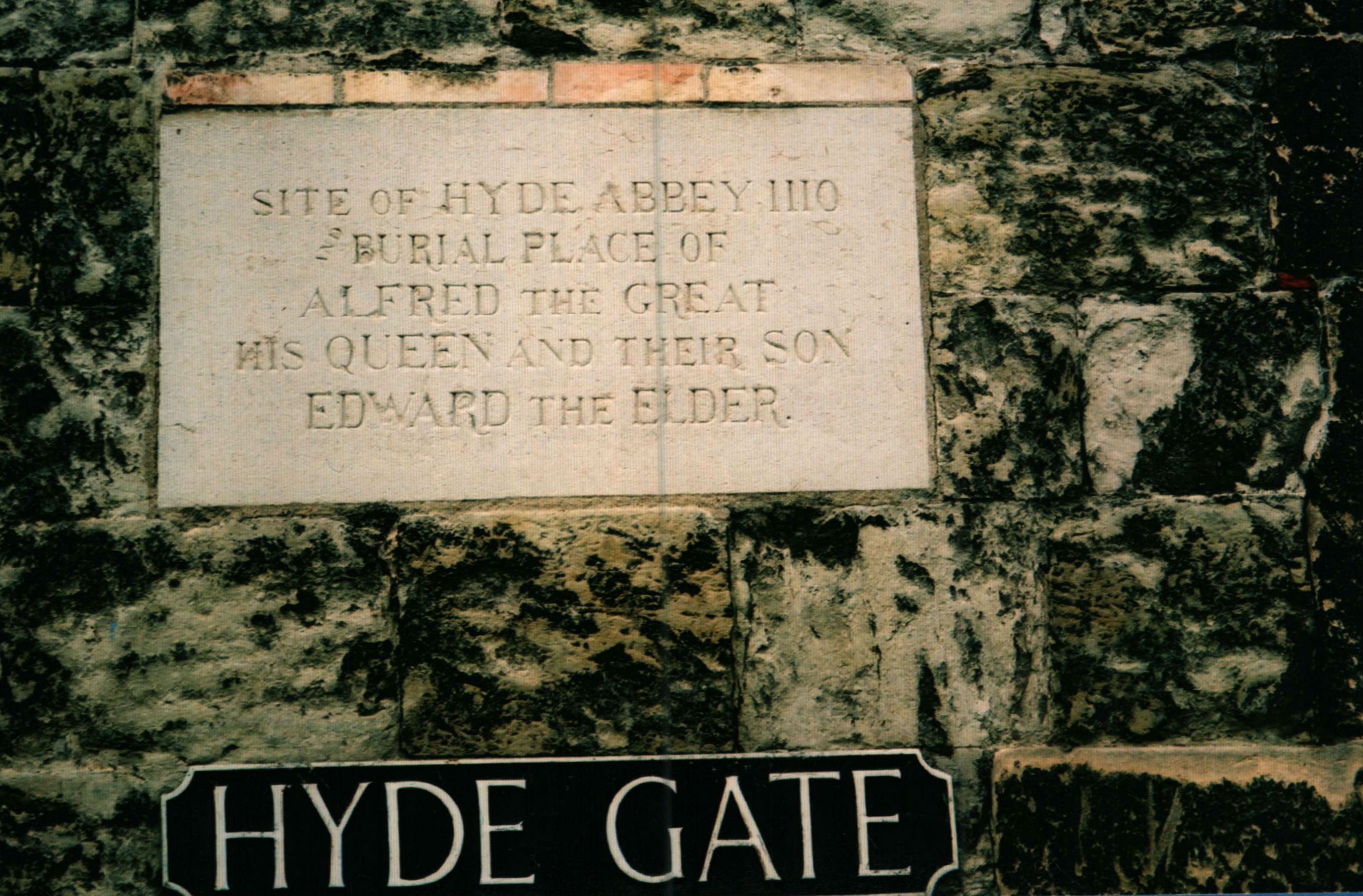 Below left: all that remains of the great abbey of Hyde, and right: a close up of the plaque to the left of the arch.