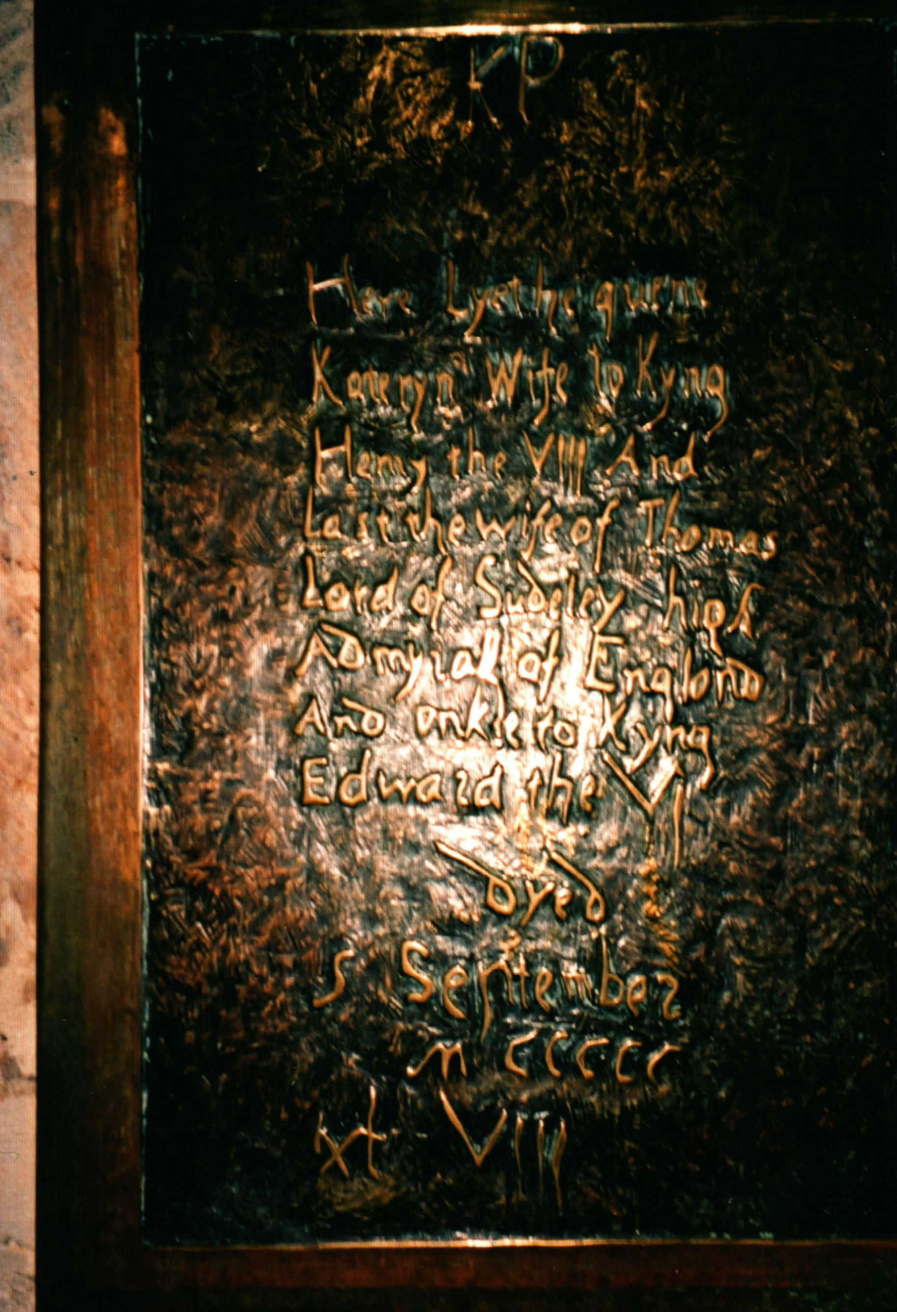 Above right: memorial plaque to Queen Kathryn which reads: ‘Here lieth Quene Kateryn Wife to Kyng Henry VIII And last the wife of Thomas Lord of Sudeley high Admiral of England and Unkle to Kyng Edward the VI; he dyed 5 September MCCCCXLVIII (1548)’.